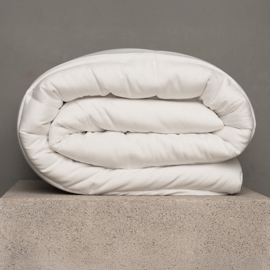 שמיכת פוך דמוי פלומה – מילוי איכותי המדמה פלומה טבעית, עוטפת ומחממת אך עדיין נושמת, עם מעטפת כותנה סאטן רכה ומפנקת.